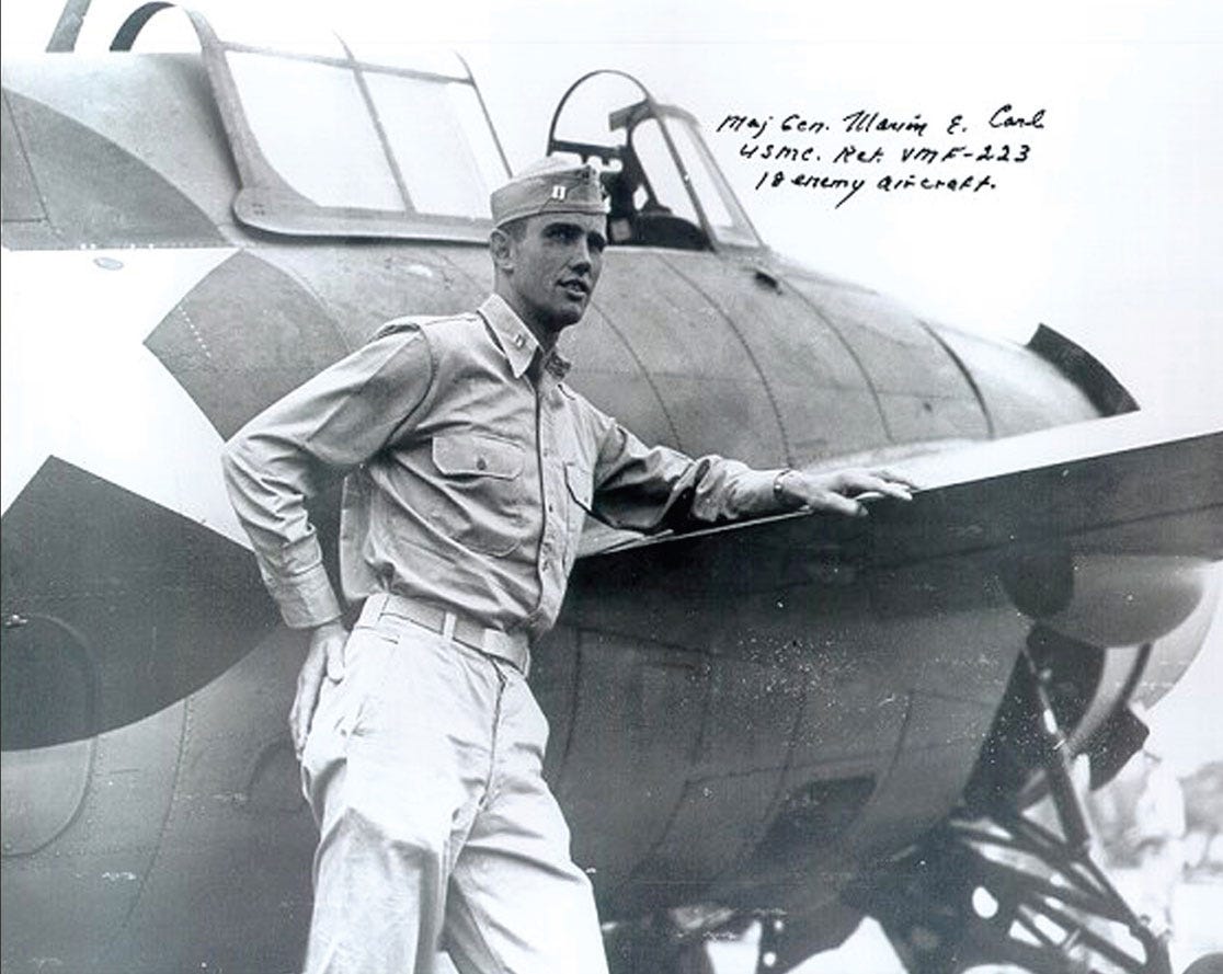Born in Hubbard, Oregon, in 1915, Marion Carl entered flight training at NAS Pensacola in 1938 and quickly proved himself an exceptional pilot. After Guadalcanal, he went on to command VMF-223, re-equipped with the new F4U Corsair, and finished the war credited with 18½ aerial victories, making him one of the Marine Corps’ top fighter aces.
